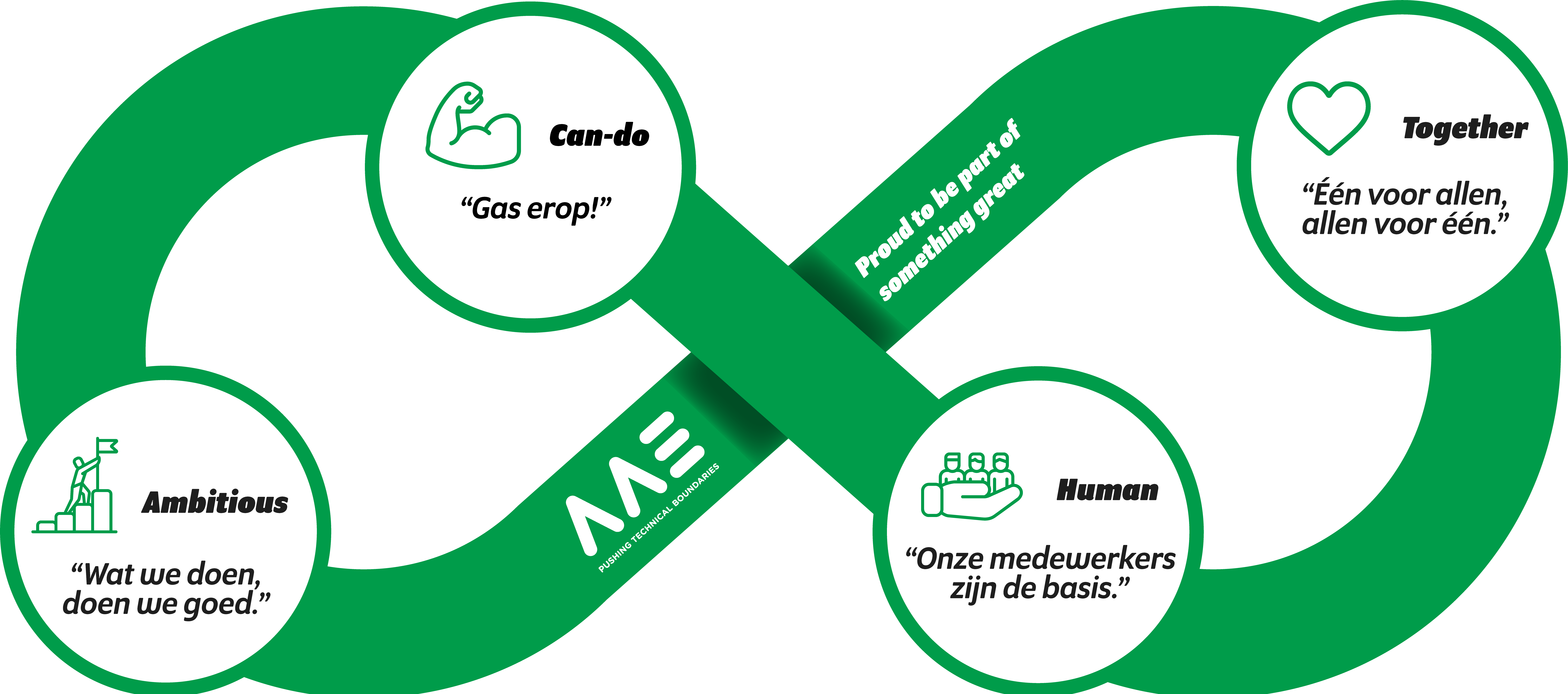 We rely on each other in everything we do, no one is ever alone. We take care of each other: one for all, all for one. We invest in a top working atmosphere through promoting transparency and open communication, both within AAE and with you. Together we can be more than just a sum of the parts, we can be part of something truly great.